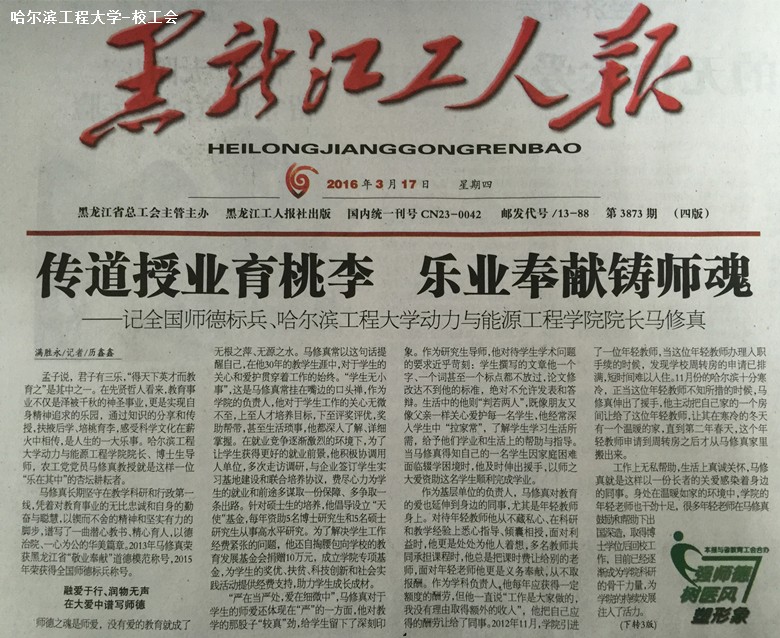 3月17日,《黑龙江工人报》在头版头条位置刊发了题名《传道授业育桃李乐业奉献铸师魂》的人物通讯,深度报道了我校教授马修真的师德先进事迹。
