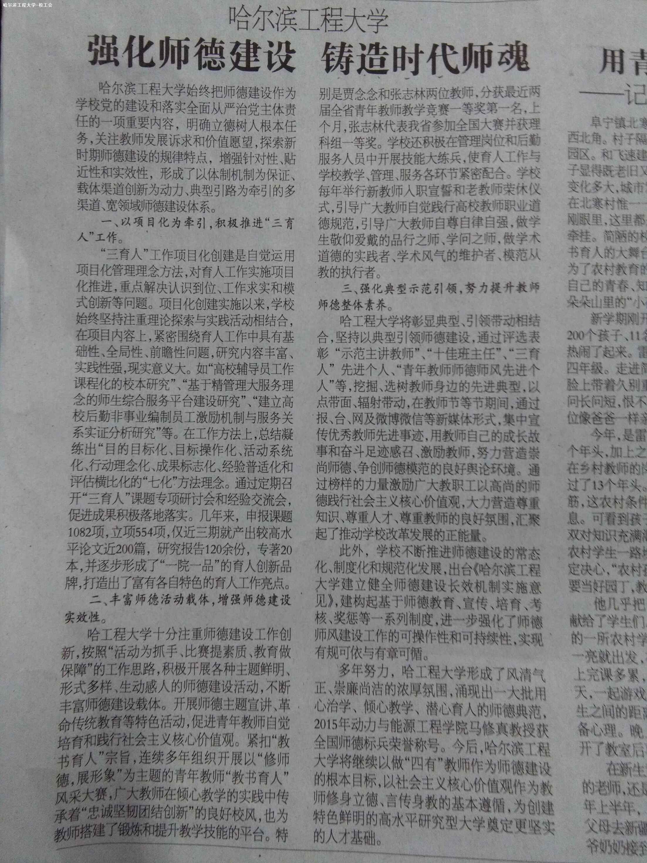 文章指出,哈尔滨工程大学始终站在培养中国特色社会主义合格建设者与可靠接班人的政治高度,把师德建设作为学校加强党的建设重要内容,明确立德树人根本任务,发挥社会主义核心价值观的引领作用,关注教师发展诉求和价值愿望,探索新时期师德建设的规律特点,增强针对性、贴近性和实效性,形成了以体制机制为保证、载体渠道创新为动力、典型引路为牵引的多渠道、宽领域师德建设体系,进一步促进了学校风清气正、崇廉尚洁教书育人氛围的营造,使广大教师更加牢固树立起做有理想信念、有道德情操、有扎实学识、有仁爱之心的“四有”教师标准,修身立德、言传身教,用心治学、倾心教学与潜心育人,为创建特色鲜明高水平研究型大学奠定了更加坚实的人才保证。