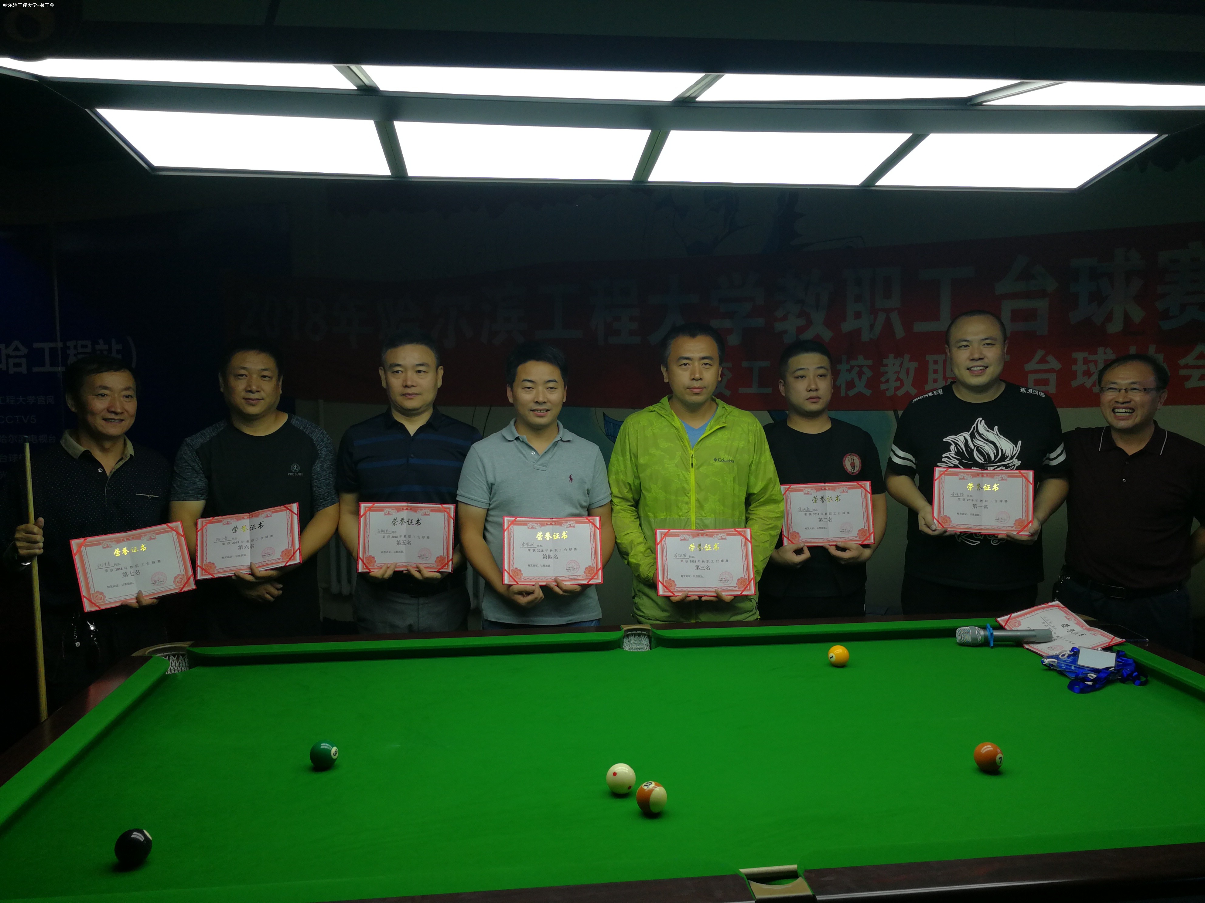 经过6轮132场紧张激烈的比赛,产业工会的李晓陨获得第一名;后勤集团工会的蒋胜磊、李铁军、李景刚分获第二、三、四名;机关工会的马朝昆、工程训练中心工会的陈峰、水声工程学院工会的纪祥春和机电工程学院工会的牟道富分获五至八名。计算机科学与技术学院工会、机关工会、产业工会和后勤集团工会获“优秀组织奖”。